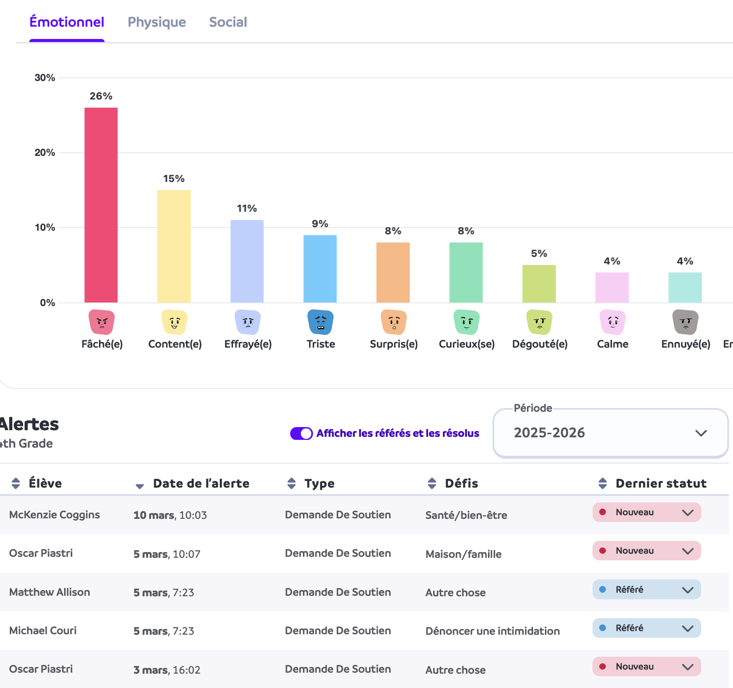 Les enseignants voient la distribution émotionnelle, les tendances et l'historique des derniers bilans pour chaque élève.